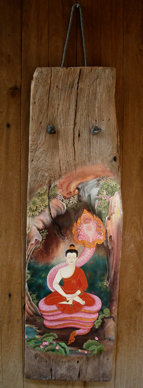เทคนิค จิตรกรรมไทยบนไม้สักเก่า โดยใช้สีอคลีลิคที่ใช้เขียนตามโบสถวิหาร ( ไม่ใช่สีอลีลิคทาตามบ้านทั่วไป ) มีความทนทานสูง เคลือบกันฝุ่น เรียบร้อยเเล้ว