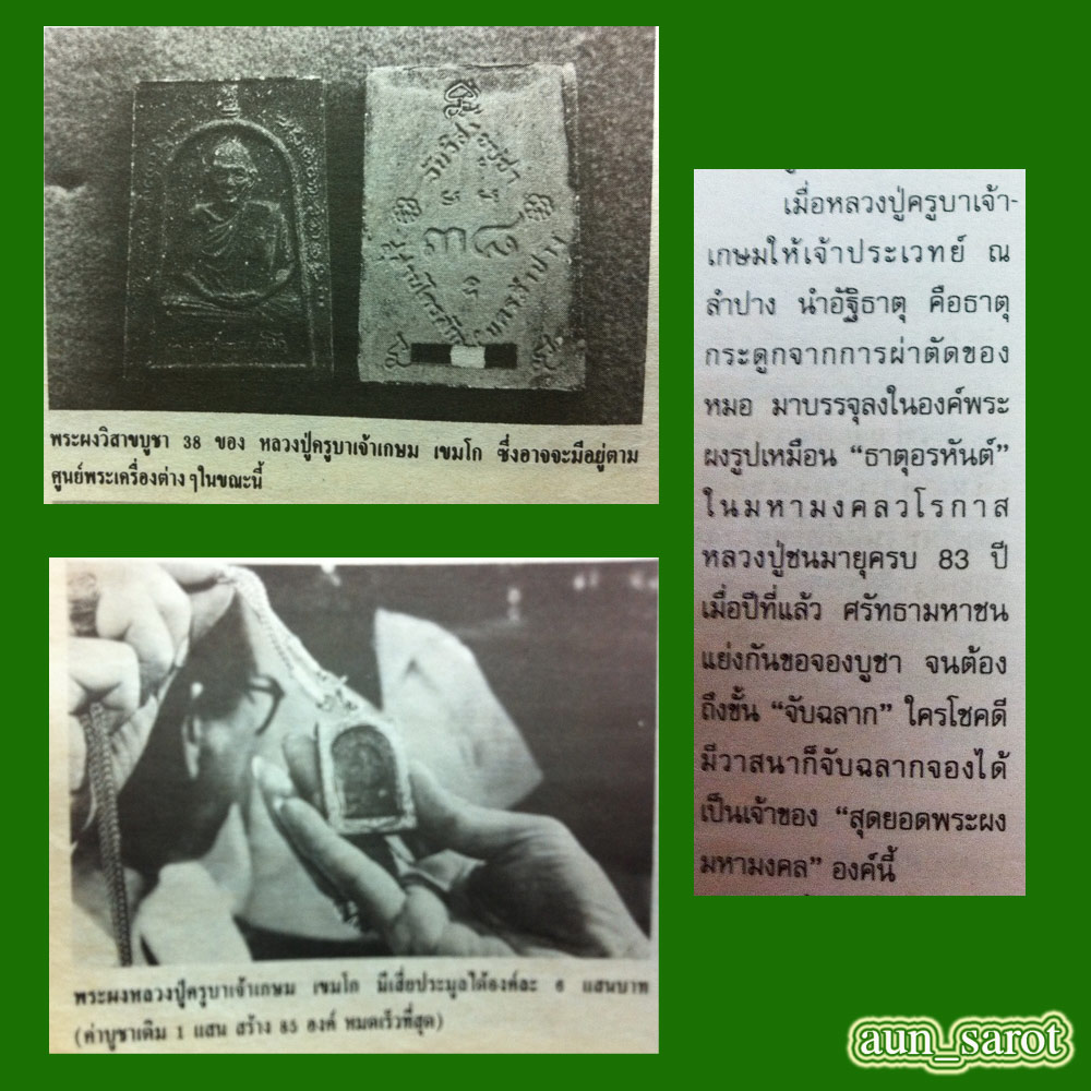 พระผงพิเศษเนื่องจากมีมวลสารอยู่อย่างหนึ่งที่นำมาผสมในเนื้อพระนั่นคือกระดูกสันหลังของหลวงพ่อเกษมที่ศิษย์ใกล้ชิดได้เก็บไว้ในคราวที่หลวงพ่อเข้าผ่าตัดกระดูกสันหลังในราวปี 25-29 ครับ กระจายอยู่ตามองค์พระก้อนเล็กบ้างใหญ่บ้างครับ ติดจีวร ริบบิ้นธงชาติ หายากมากครับเนื่องจากจำนวนการสร้างน้อยมาก พร้อมกล่องเดิมๆ