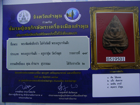 กลีบบัวรุ่นแรก ครูบาจันต๊ะพร้อมใบประกาศที่ 2 งานนิทรรสการประกวดพระเครื่องลำพูน
