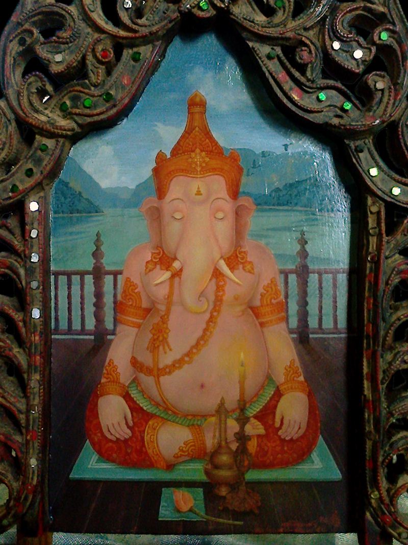 ดำเนินมาชิ้นที่ 28 แล้ว สำหรับผลงานชิ้นนี้ ซึ่งเริ่มต้นนับเป็นชิ้นได้ก็ 2 ปีแล้ว ปัจจุบันก็ย่างเข้าปีที่สาม เฉลี่ยผลงานต่อปี ก็แค่ 14 ชิ้นต่อ 1 ปี / 1 เดือนก็ประมาณ 1 ชิ้น เท่านั้นซึ่งนับว่าช้ามากเมื่อเทียบกับคนทำศิลปะคนอื่นๆ แต่ถึงจะอย่างไรก็ตาม ณ ปัจจุบัน ก็มีความสุข รัก มุ่งมั่นในเป้าหมายในสิ่งที่ทำ ก็น่าจะเป็นเหตุผลที่เพียงพอแล้วนะคะ มาเข้าเรื่องผลงานชิ้นที่ 28 นี้เลยค่ะ ผลงานชื่อ พระพิฆเนศ ฯ ซึ่งตามความเชื่อที่เราๆรู้กัน ก็คือเทพเจ้าแห่งความสำเร็จ สำเร็จทุกๆอย่าง ซึ่งตามตำราต่างๆ ก็จะมีอยู่หลายๆ ปาง เช่นบางตำรา ว่าไว้ 32ปาง แต่ละปางเวลาบูชาให้คุณในด้านต่างๆ แต่พระพิฆเนศ ชิ้นนี้ ไม่ได้ระบุว่าอยู่ในปางใดๆ ทั้งสิ้น แต่แฝงด้วยคติความหมาย ว่าด้วยเรื่องความสำเร็จ ซึ่งค่อนข้างเอนเอียงไปในคำสอนทางด้านพระพุทธศาสนา กล่าวคือ ว่าด้วยเรื่องพระพิฆเนศ พระพิฆเนศนั้นโดยกายภาพคือ ตัวเป็นคน เศียรเป็นช้างทุกคนต่างรู้ มีงาด้านใดด้านหนึ่งหัก แต่ผลงานชิ้นนี้ มีครบทั้งสองงา แต่มีรอยเชื่อมต่องาด้านขวาซึ่งแฝงด้วยความหมายคือ พระพิฆเนศนั้นเป็นเทพชั้นสูงตามคติพารหม์ ฉะนั้นเมื่องาหักแล้ว ขนาดเศียรยังต่อได้ทำไมแค่งาหักถึงเนรมิตต่อไม่ได้ บางทีอาจจะต่อโดยไม่มีรอยต่อเหมือนงานชิ้นนี้ด้วยซ้ำ แต่ที่เขียนให้รู้ว่ามีรอยต่อก็เพราะอยากสื่อความหมายถึงท่านผู้เสพให้เอะใจว่าทำไมงาถึงมีครบ และแฝงด้วยคติความหมายว่า เมื่อคนเราทำอะไรผิดพลาด เราไม่ควรกลัว หรือท้อแท้ หรือปล่อยปละละเลยจนลืมเป็นนิสัย แต่เราควรหาทางแก้ไข และดีใจที่เมื่อสิ่งที่เกิดความผิดพลาดก็หมายความว่าสิ่งที่เราประสบอยู่นั้นยังไม่สมบูรณ์ เเละมีปัญหาที่ควรแก้ไข