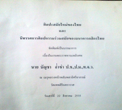 ไม่ได้สร้างเพื่อจำหน่ายนะครับ ในหนังสือเหมือนเป็นการเล่าประวัติความเป็นมาของวิวัฒนาการศิลปะไทยเราในช่วงระยะเวลาหนึ่ง ซึ่งเป็นช่วงก้าวสำคัญในการพัฒนาศิลปะบ้านเราให้มาจนถึงปัจจุบัน ซึ่งเนื้อหามีความน่าสนใจอย่างยิ่ง ไม่ได้เล่าเฉพาะข้อมูลเพียงอย่างเดียว ยังได้นำศิลปะในการแข่งขันประกวดที่ทางธนาคารกสิกรได้คอยสนับสนุนในอดีตที่เคยเป็นตำนานทุกตอน มาร่วมเล่าโดยใช้ภาพศิลปะเหมือนบอกเล่าอีกทางหนึ่ง จากสมัยหนึ่งถึงสมัยหนึ่ง พร้อมสรุป