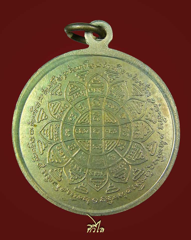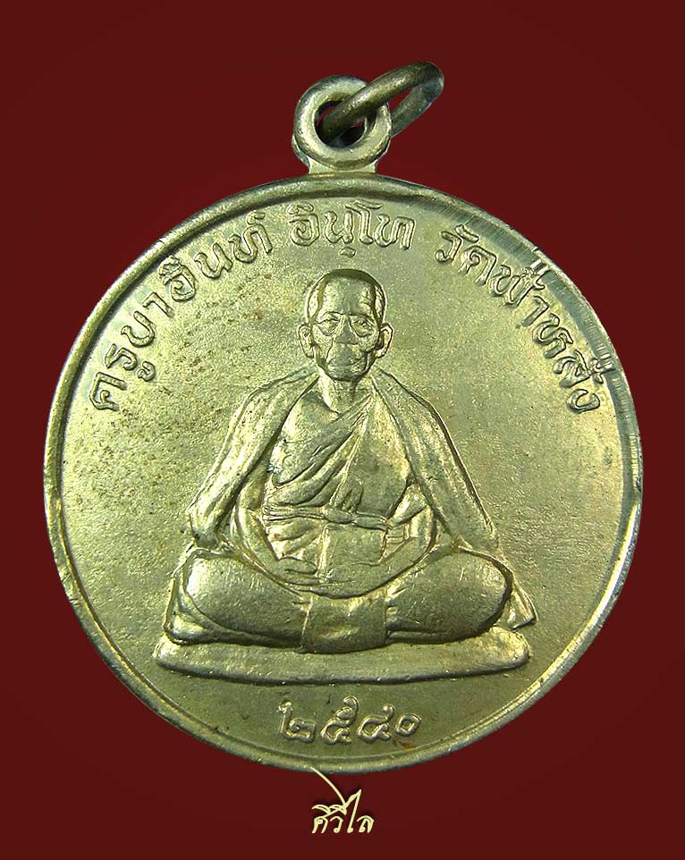 หลัง ยันต์มงกุฎพระพุทธเจ้าอันศักดิ์สิทธิ์ สร้างปี พ.ศ. 2540 โดย อ.เฒ่า สุพรรณ เพื่อสมทบทุนสร้างมณฑปและเมรุ วัดหัวเด่น สุพรรณบุรี ซึ่ง อ.เฒ่า ได้ทำพิธีขออนุญาตหลวงพ่อกวยเพื่อใช้ยันต์มงกุฎพระพุทธเจ้าไว้หลังเหรียญ หลวงปู่ และได้จุดธูปอัญเชิญขอหลวงพ่อกวยให้มาช่วยปลุกเสกด้วย แล้วเอาไปให้หลวงปู่ครูบาอิน อินโท เสกนานถึง 4 เดือน เข้าพิธีพุทธาภิเษกใหญ่ที่วัดหม้อคำตอง เชียงใหม่ อีก 7 วัน 7 คืน แล้วนำกลับไปให้หลวงปู่เสกอีก จนหลวงปู่บอกว่าเสกไม่เข้าแล้ว และขอเหรียญนี้ไว้จำนวนหนึ่ง โดยให้เหตุผลว่า"กลัวคนเจียงใหม่จะบ่ได้ใช้ของดีๆ"