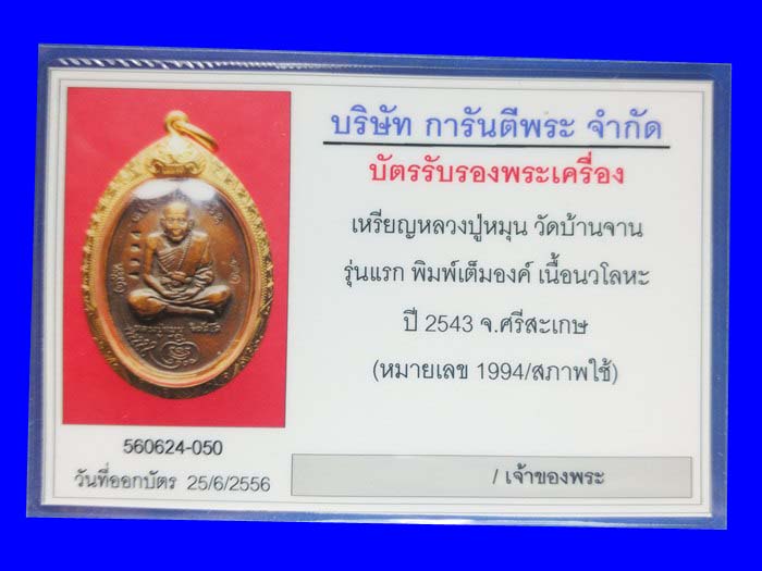 เหรียญมนต์พระกาฬ หลวงปู่หมุน วัดบ้านจารเนื้อนวะโลหะ หมายเลข 1994 เลขสวยพร้อมทองแท้ และบัตรรับประกันครับใครที่กำลังมองหาเหรียญแท้ต้องรีบหน่อยนะครับปัจจุบัน หายากแล้วครับนานๆจะออกมาให้เห็นน้อยมากครับ การจัดสร้างด้วยกัน 4 เนื้อ คือ