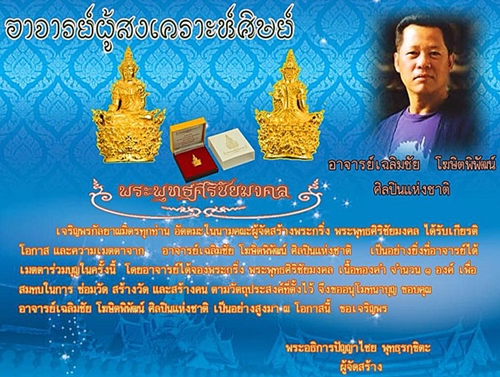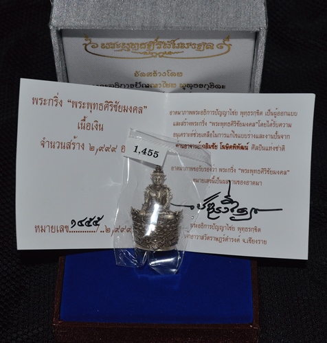 ได้รับความอนุเคราะห์จากท่าน " อาจารย์ เฉลิมชัย โฆษิตพิพัฒน์ " ( ศิลปินแห่งชาติ ) ช่วยแก้ไขขัดเกลารูปแบบและงานปั้นพุทธศิลป์ เนื้อเงินสวยๆเลข # ๑๔๕๕ ครับ..( มีรูปให้ชมเพิ่มครับ )