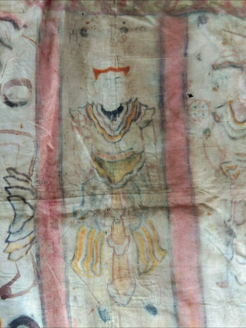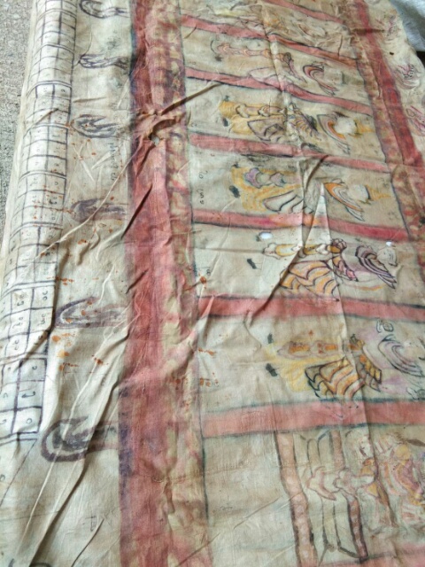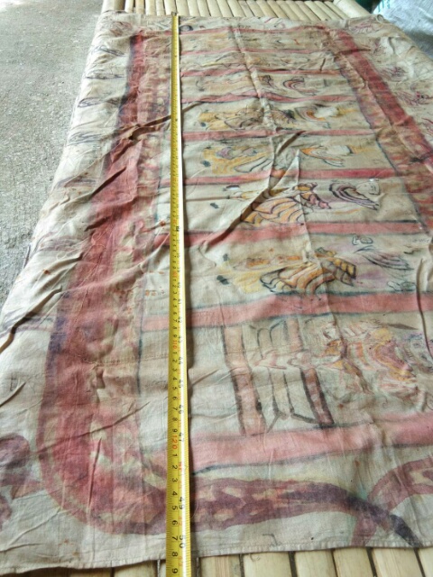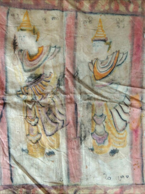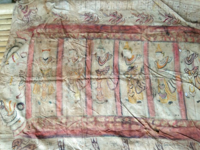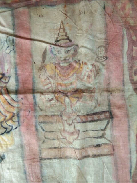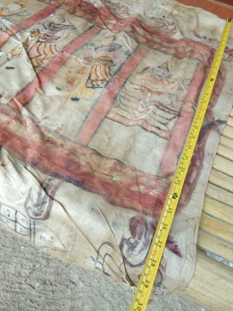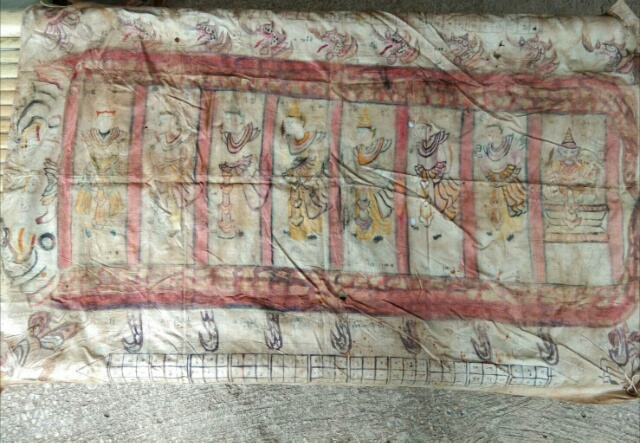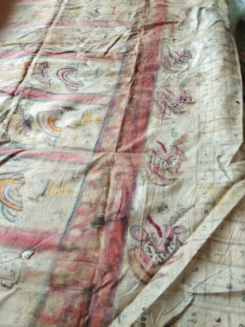 ผ้ายันต์โบราณเก่าร้อยกว่าปี ยาวเมตรกว่า ศิลป์พม่าสีฝุ่นเก่า