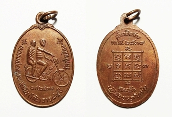 เหรียญหลวงพ่อโก๊ะ ซ้อนมอเตอร์ไซค์(ขาไป) วัดเก้าห้อง อยุธยา ปี 2534