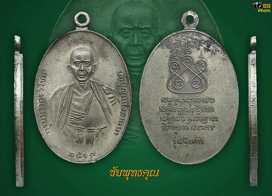 เหรียญครูบาเจ้าศรีวิชัย สิริวิชโย เนื้อนวะโลหะเศียรหนาม 7แตก บ. (นิยม) พร้อมกล่อง วัดบ้านปาง อ.ลี้ จ.ลำพูน จัดสร้างเมื่อปี 2517 โดยมีพระเจ้าวรวงศ์เธอพระองค์เจ้าภาณุพันธ์ ยุคล เป็นองค์ประธาน และคุณนิตย์ พงษ์ลัดดา เป็นผู้ดำเนินการสร้าง ช่างผู้บรรจงแกะแม่พิมพ์ คือ ช่างยิ้ม ยอดเมือง ช่างผู้มากด้วยฝีมือเป็นที่ยอมรับโดยทั่วไปพระเถราจารย์ผู้ร่วมพิธีพุทธาภิเษก ล้วนแต่เป็นพระอริยะสงฆ์ ดังมีรายนามดังต่อไปนี้1.ครูบาพรหมจักร วัดพระพุทธบาทตากผ้า 2.ครูบาอินทจักร์ วัดน้ำบ่อหลวง 3.ครูบาคำแสน คุณาลังกาโร วัดป่าดอนมูล 4.ครูบาชุ่ม โพธิโก วัดวังมุย 5.หลวงพ่อสิม พุทธาจาโร วัดสันติธรรม ( หรือที่รู้จักว่าปัจจุบัน คือ หลวงพ่อสิม วัดถ้ำผาปล่อง ) 6.ครูบาชัยวงศ์ษา วัดพระบาทห้วยต้ม 7.ครูบาทึม วัดจามเทวี 8.ครูบาสุรินทร์ วัดศรีเตี้ย 9.ครูบาสิงห์ชัย วัดป่าซางงาม 10.ครูบาสุข วัดป่าซางน้อย เจ้าอาวาสวัดบ้านปาง และท่านเจ้าคุณพระเทพสารเวที เจ้าคณะภาคเหนือธรรมยุต เป็นประธานฝ่ายสงฆ์นั่งปรกในพิธี เริ่มพิธีพุทธาภิเษก เมื่อวันที่ ๒๔ ตุลาคม ๒๕๑๗ เวลา 21.19 น. ณ.วัดบ้านปาง อ.ลี้ จ.ลำพูน
