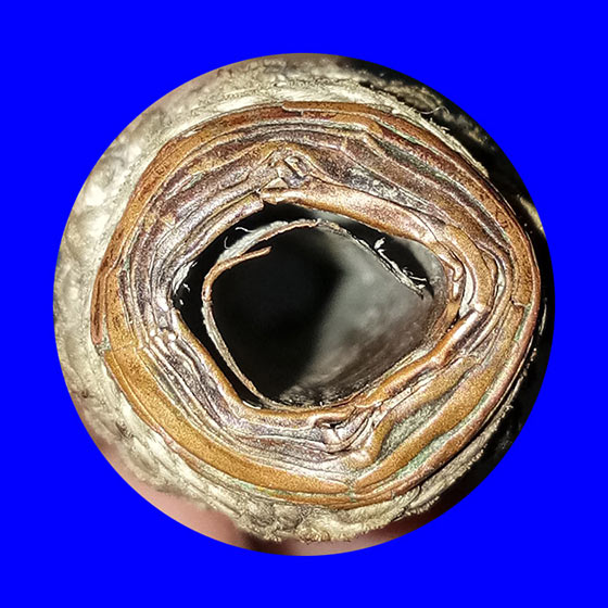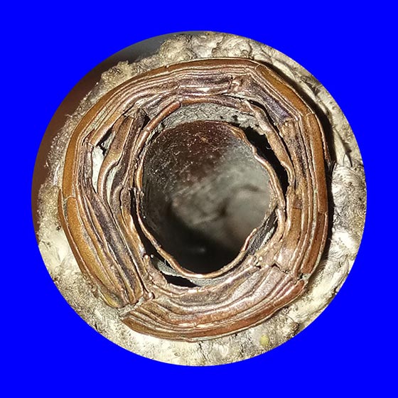 ตะกรุดหลวงพ่อทบไส้ทองแดงล้วนม้วนหนาๆ..ส่องเห็นรอยจารด้านในได้อย่างชัดเจน..ตะกรุดถักด้วยเชือกปอ ลายชานหมาก โดยถักแบบไว้หัว-ท้าย ทั้ง2ข้าง ขนาดโดยประมาณยาว 4นิ้ว 2หุน โต 1.5ซม. ..สังเกตุโลหะที่ใช้สร้างจะแสดงความเก่าตามอายุ/เวลาและการใช้งานครับ