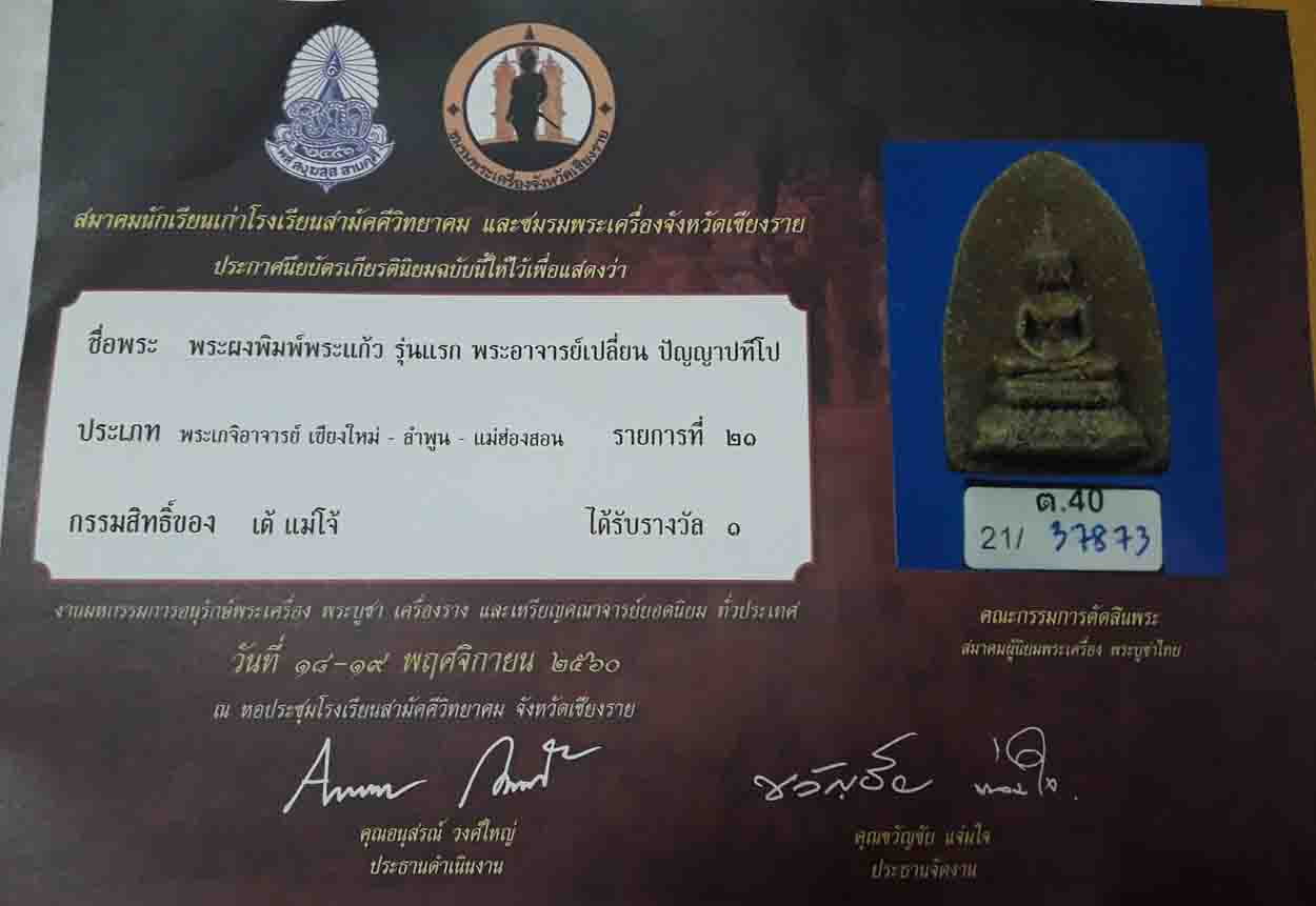 พระองค์นี้ถือว่าสภาพสวยติดหน้าตาชัดเจน มาพร้อมใบประกาศรางวัลที่ 1 งานเชียงใหม่