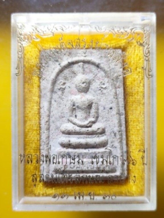 สมเด็จสรงน้ำหลังอุ ปี 30 เนื้อพิเศษ พร้อมกล่องเดิม หลวงพ่อเกษม เขมโก จ.ลำปาง แท้ทัน 1 ใน 1000 องค์ ซึ่ง เป็นอีกรุ่นที่รวบรวมมวลสารชั้นครูของหลวงพ่อ นอกจาก ข้าวก้นบาตรที่หลวงพ่อหยิบขบฉัน แล้ว เนื้อแบบนี้ เรียกว่า เนื้อก้นครก แห้งแกร่ง จำนวนการจัดสร้าง 1000 องค์ มวลสารประกอบด้วย เกศาหลวงพ่อ ก้านธูปอธิษฐานจิต (องค์นี้เห็นเกศาลอยชัดชัด ) พระผงมงคลหนึ่ง และพระผงมงคลสอง เศษพระผงสมเด็จบางขุนพรมที่แตกหัก นำมาบดละเอียด ด้วยจำนวนเนื้อพิเศษที่สร้างได้น้อย ทำให้รุ่นนี้เป็นอีกรุ่นที่เป็นที่ต้องการ ของ ผู้ที่ศรัทธาต่างเสาะแสวงหารุ่นนี้ ที่มีมวลสารมหามงคลดังกล่าวมาขึ้นคอ รับประกันตามกฎทุกประการ (กล่องตรงเขี้ยวยึดหักไม่มีผลต่อพระเครื่อง)