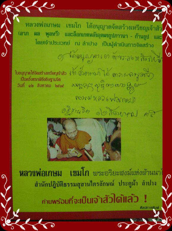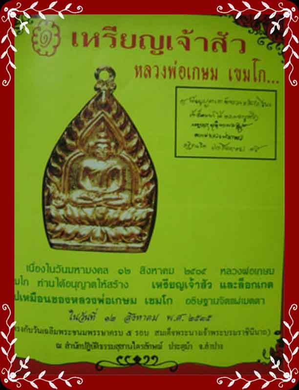เหรียญเจ้าสัว หลวงพ่อเกษม เขมโก สุสานไตรลักษณ์ เนื้อทองแดงรุ่นนี้ พิธีพุทธาภิเษกเมื่อ 12 สิงหาคม 2535