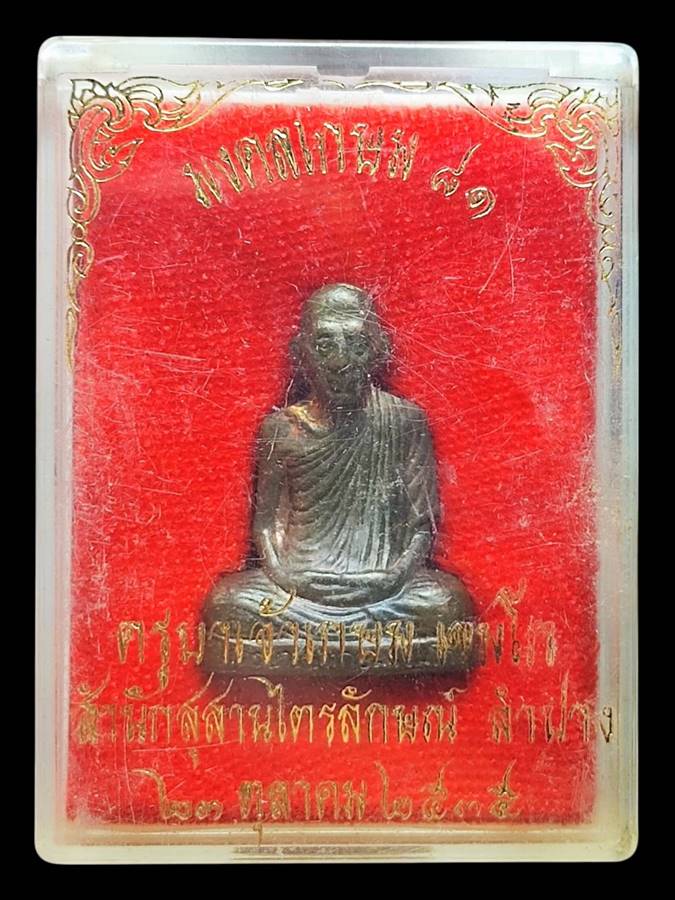 รูปหล่อลอยองค์ปั๊ม เนื้อนวะโลหะ (บรรจุมวลสาร 9 มงคล) รุ่นมงคลเกษม 81 ผิวเดิม หลวงพ่อเกษม เขมโก เมตตาอธิษฐานจิตปลุกเสกเมื่อวันที่ 23 ตุลาคม 2535 ใต้ฐานบรรจุมวลสาร 9 มงคล และอุดขี้ผึ้งเทียนชัย ข้าวก้นบาตรและมวลสารอันศักดิ์สิทธิ์ไว้ ตอกโค๊ต "เกษม" ชัดเจน พร้อมกล่องเดิม